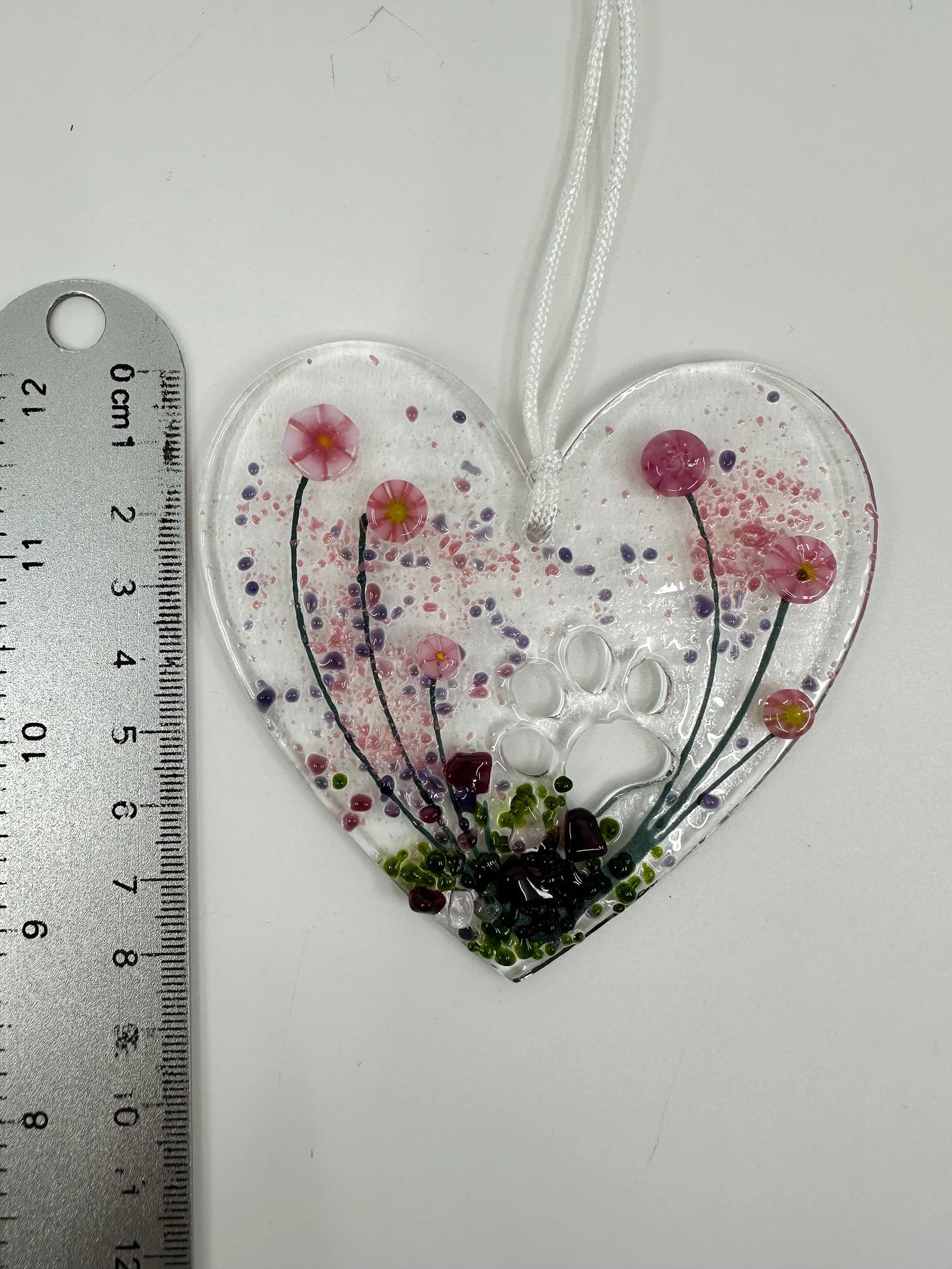Handmade by myself in my studio in Devon this beautiful pink hanging heart with a paw print is perfect for that special gift. Heart measures approx 9cm tall and 9 cm wide at it widest point.