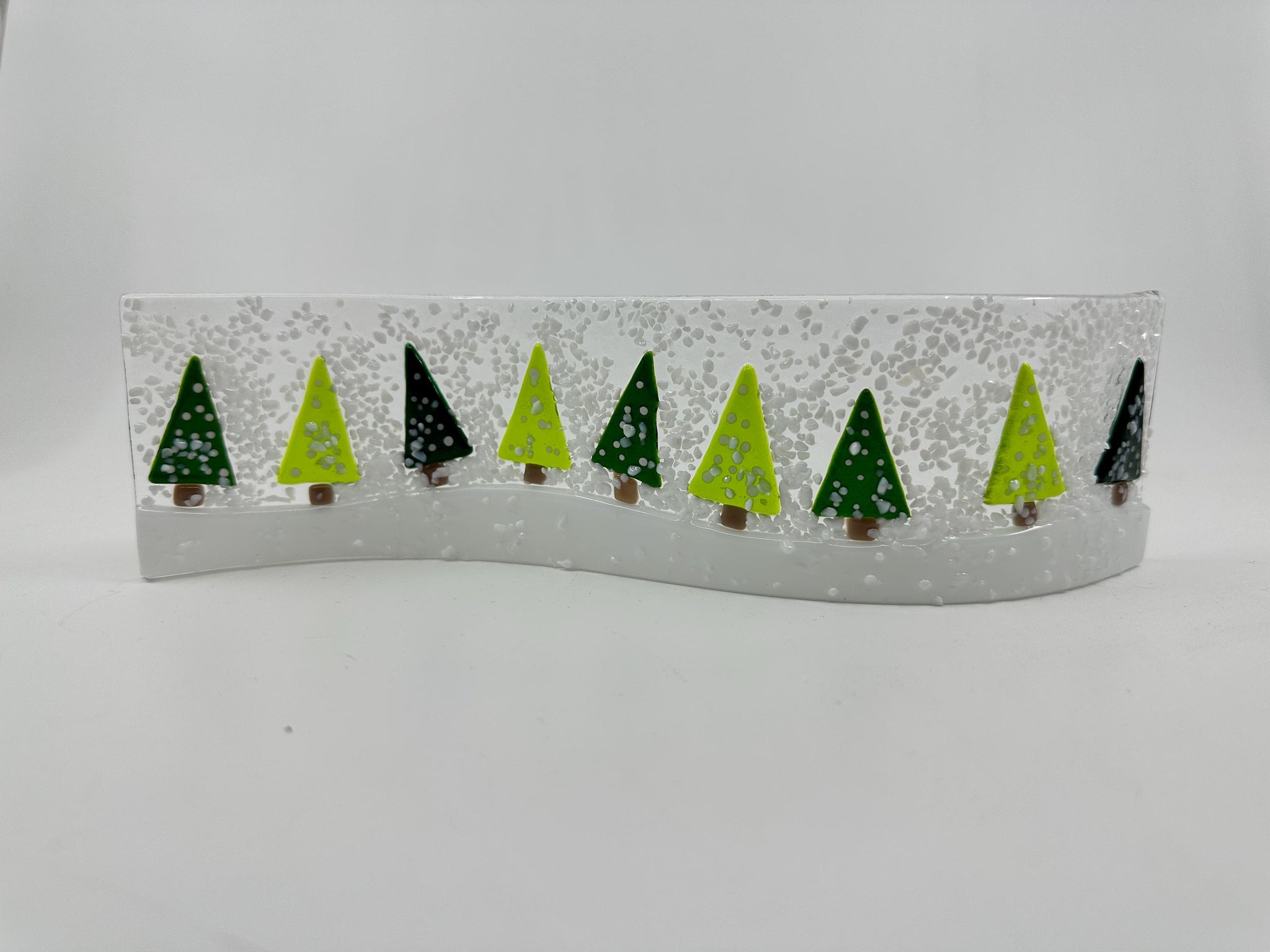 A beautiful Blue Christmas Tree wave done in a variety of blues with white enamel dots on the trees set in a snowy scene. Measuring 25 cm long, 6 cm high and 6mm deep. Each of these trees have been individually cut by hand and white enamel has been used for the dots on the trees. This piece has been fired in the kiln for over 2 days with each firing lasting roughly a day. Before this piece goes into the kiln for its final firing it is checked over for any flaws. The final firing last over 24 hours this is where the glass takes its shape on a ceramic former. The final result is a free standing wave on a s curve allowing it to stand freely. Due to the making of this piece some variation will occur.